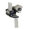 A deluxe tape dispenser with metal side plates on both sides for maximum strength and dependability. Spring return Metal non reversing plate holds tape in position. Sturdy adjustable tension brake allows smooth operation with any packaging tape.